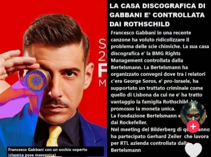 Al centro di tutto ci sarebbe un video pubblicato sul canale TikTok Perseo (@perseo0487), in cui l’autore sostiene che la BMG, etichetta di Gabbani, sia collegata alla famiglia Rothschild. Il contenuto cita anche un recente brano del cantante che, secondo l’autore del post, “ridicolizzerebbe” la teoria delle scie chimiche, alimentando così ulteriori sospetti tra i complottisti. Il video collega poi la Bertelsmann Foundation ad alcuni eventi organizzati con relatori internazionali come George Soros, accusato di sostenere Israele e di aver firmato presunti trattati “a vantaggio delle potenze mondiali”. Nelle stesse teorie viene citato anche Gerhard Zeiler, dirigente del gruppo RTL, il quale, secondo la ricostruzione del video, rappresenterebbe “l’anello di congiunzione” tra media, politica e musica.